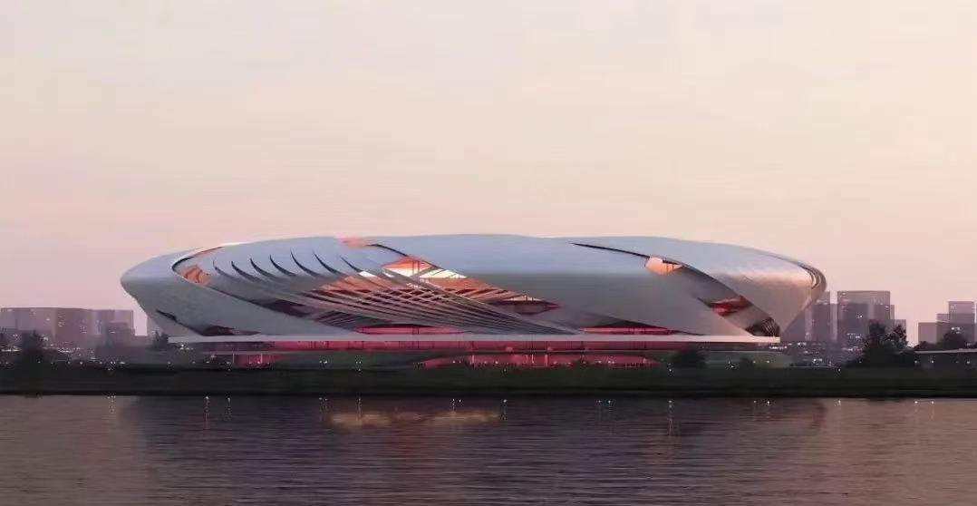 長沙是中國革命的發(fā)源地,方案以“紅色搖籃,蝶舞湘江”為創(chuàng)作原點,由正反各九片單元網殼交錯疊合,與內部的紅色體育場共構體育場基本形態(tài),使長沙這片熱土淬煉出的人文精神盡顯于丹韻銀律的編織錯動之中。
