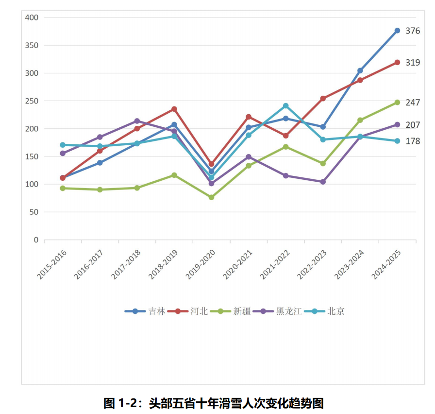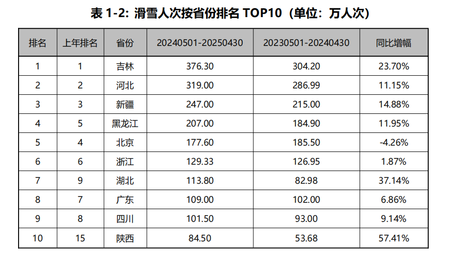 從連續(xù)十年的數(shù)據(jù)來看,吉林、河北、新疆、黑龍江、北京已形成中國滑雪目的地的頭部五省格局,華北、東北兩大區(qū)的滑雪人次占比均超過25%,合計(jì)連續(xù)兩年超過全國總量的一半。