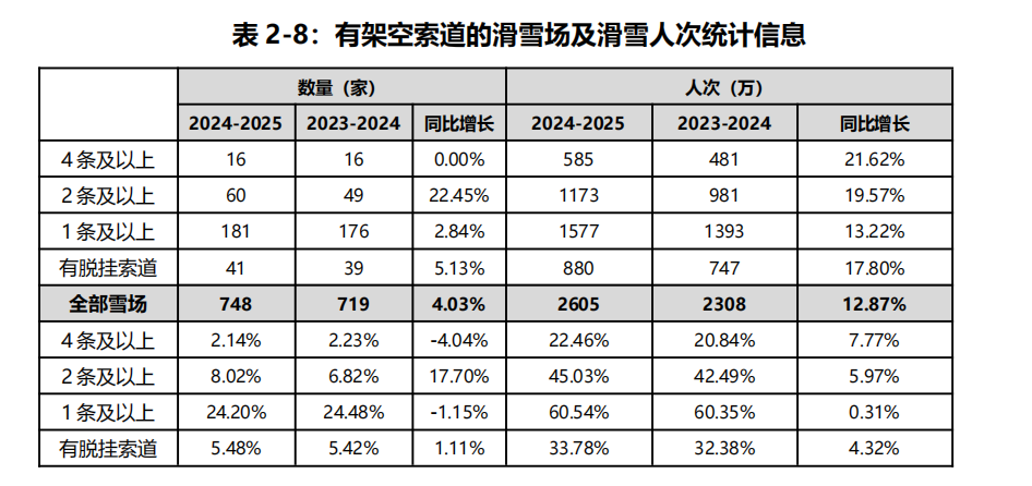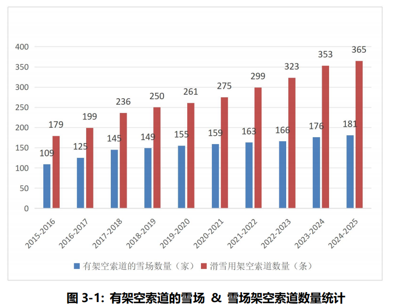 從數(shù)據(jù)來看,2024-2025雪季財(cái)年,全國新增12條滑雪架空索道,使得投入運(yùn)營的架空索道總數(shù)達(dá)到365條,分布在181家雪場之中;同期新增魔毯170條,有效補(bǔ)充了初學(xué)者和兒童滑雪需求。值得注意的是,國內(nèi)脫掛式索道發(fā)展加快,國產(chǎn)索道數(shù)量已達(dá)67條,已遠(yuǎn)遠(yuǎn)超過進(jìn)口索道數(shù)量。