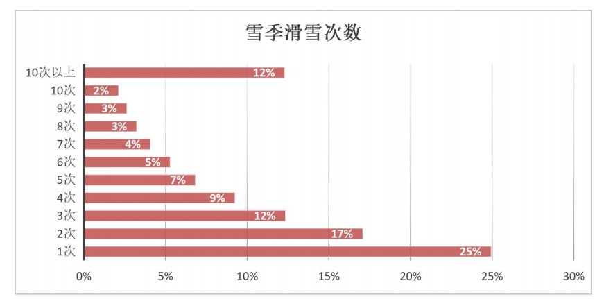 根據(jù)滑唄數(shù)據(jù),在雪季滑雪次數(shù)上,低頻用戶仍占據(jù)主體,25%的用戶每季只滑一次,17%的用戶滑兩次,合計(jì)超過四成,顯示出滑雪對(duì)大量消費(fèi)者而言仍是一種體驗(yàn)型消費(fèi)。而每季滑3–5次的群體占比約28%,構(gòu)成了從初學(xué)向進(jìn)階過渡的中堅(jiān)層。核心用戶雖然數(shù)量有限,但依然具備市場支撐力,約30%的滑雪者每季滑雪超過6次,其中12%的用戶超過10次,體現(xiàn)出穩(wěn)定的消費(fèi)黏性。