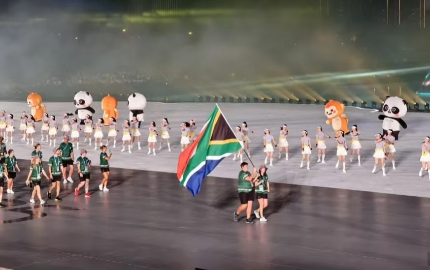 吉祥物“蜀寶”和“錦仔”引領各國運動員入場。吉祥物以大熊貓和川金絲猴為原型,命名以“蜀錦”為靈感。此外,吉祥物的設計傳達了巴蜀文化意蘊,成都的芙蓉花瓣演繹大熊貓的內(nèi)耳;三星堆出土文物幻化成川金絲猴的耳朵;蜀錦的質感與綠水青山融合,編織成吉祥物的服飾;太陽神鳥紋樣則成為服飾上的圖案。