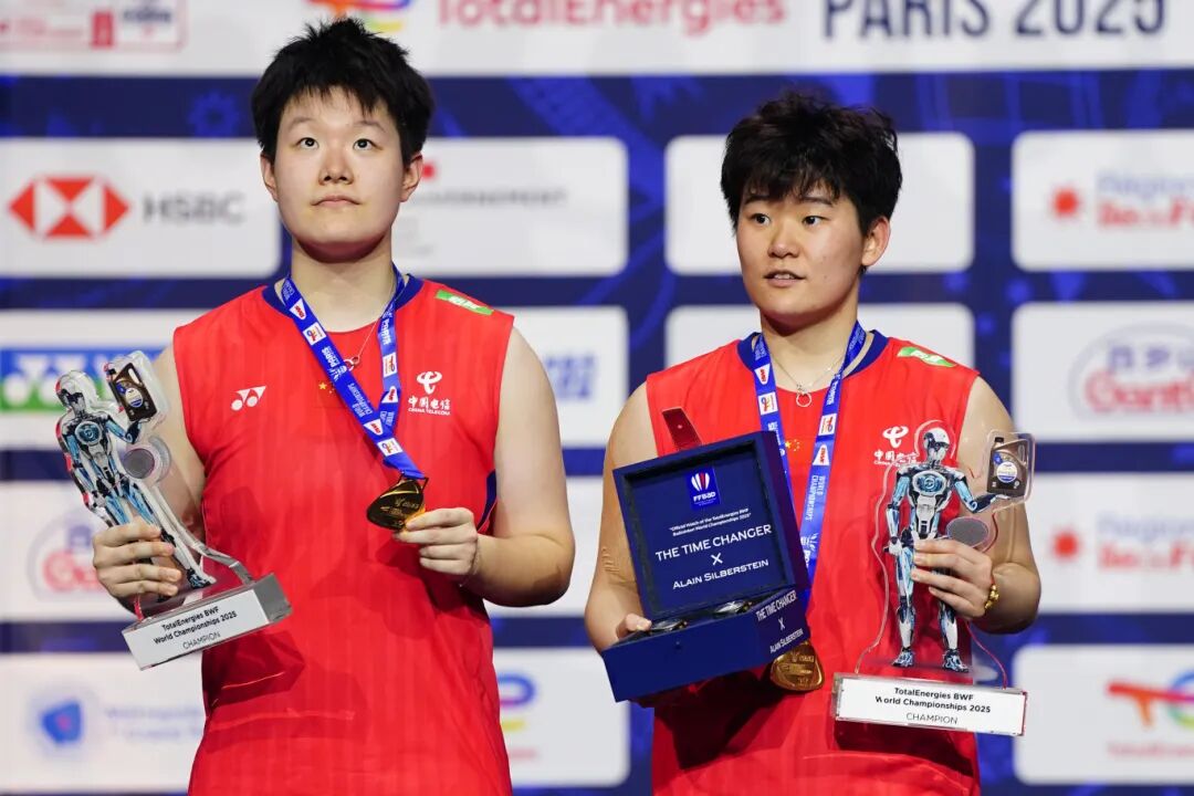 女雙決賽,頭號種子劉圣書/譚寧對陣2號種子、馬來西亞強檔陳康樂/蒂娜,經(jīng)過83分鐘的鏖戰(zhàn),“圣壇”組合以21比14、20比22、21比17戰(zhàn)勝對手,首次參加世錦賽就拿到了冠軍,也成為國羽首對“00后”雙打單項世界冠軍獲得者。